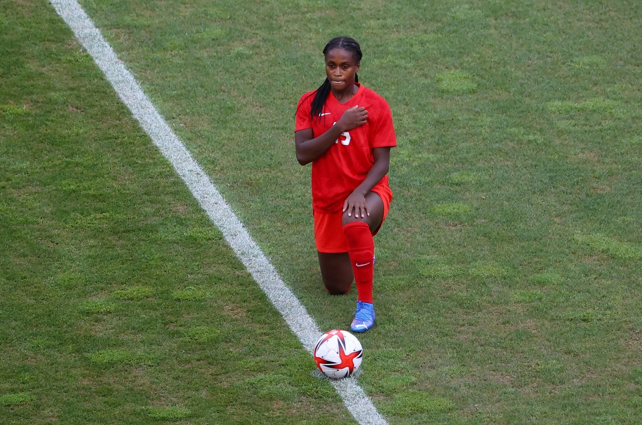 FILE PHOTO: Tokyo 2020 Olympics - Soccer Football - Women - Semifinal - United States v Canada - Ibaraki Kashima Stadium, Ibaraki, Japan - August 2, 2021. Nichelle Prince of Canada takes a knee before the match REUTERS/Mike Segar