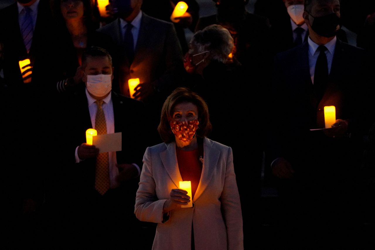 Bipartisan members of the House and Senate, including House Speaker Nancy Pelosi (D-CA), gather to hold a moment of silence for the more than 800,000 American lives lost to COVID-19 outside the U.S. Capitol building in Washington, U.S., December 14, 2021. REUTERS/Elizabeth Frantz