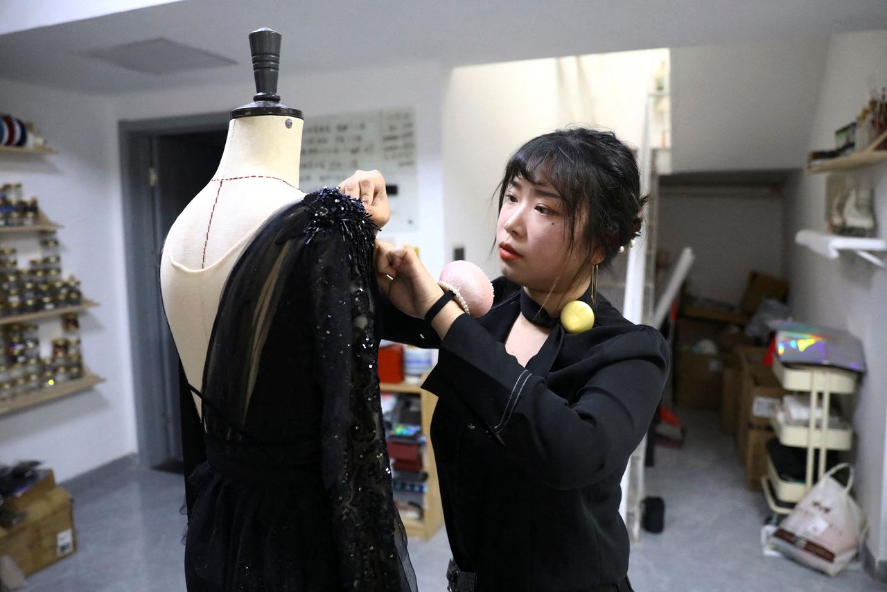 Costume designer Zhang Yifan and a tailor work on a skating dress Yifan made for her sister, figure skating athlete Zhang Yixuan, at her studio in Beijing, China December 7, 2021. REUTERS/Tingshu Wang