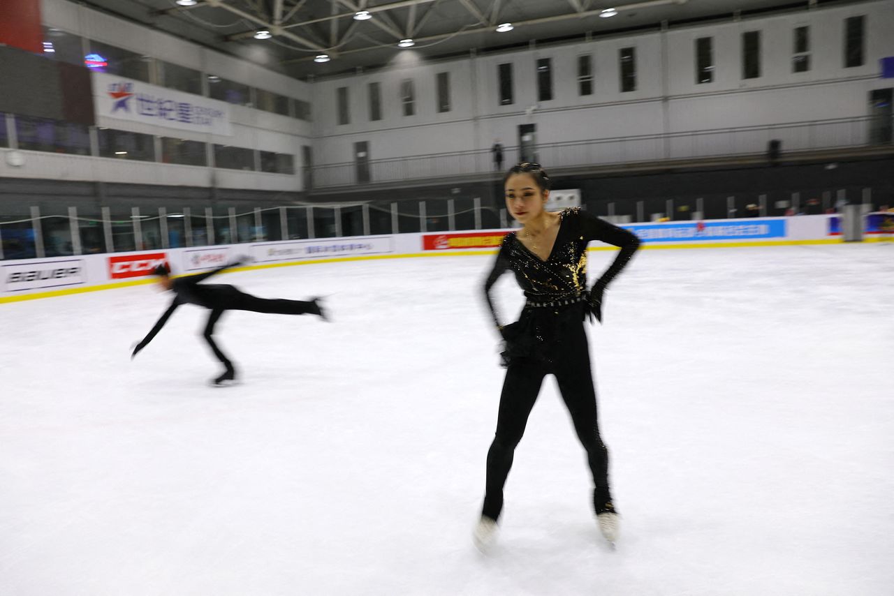 Figure skating athlete Zhang Yixuan skates as she wears a skating outfit newly-made by her sister, costume designer Zhang Yifan, during a training session at an ice rink in Beijing, China December 11, 2021.REUTERS/Tingshu Wang