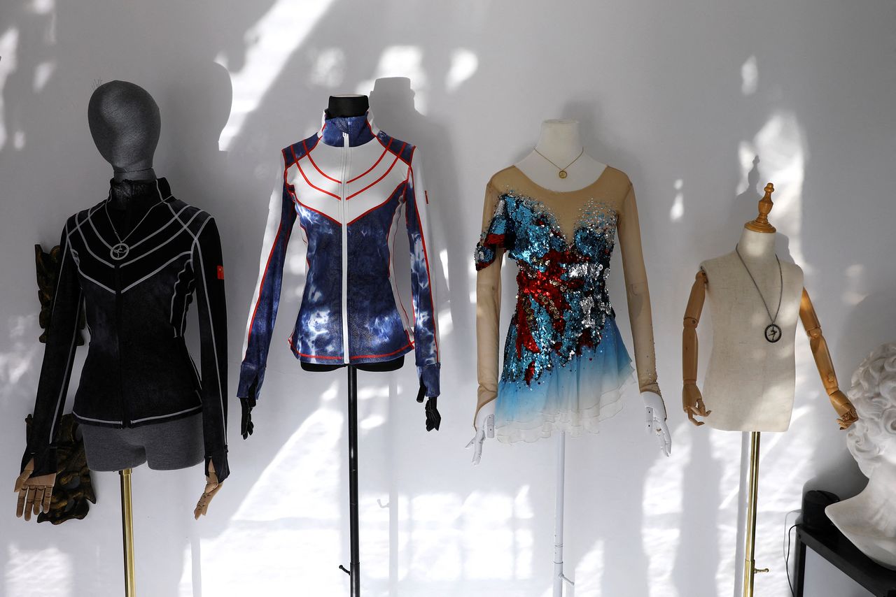 Skating jackets for training and a skating dress, which are all designed by costume designer Zhang Yifan, are displayed at her studio in Beijing, China December 7, 2021.REUTERS/Tingshu Wang