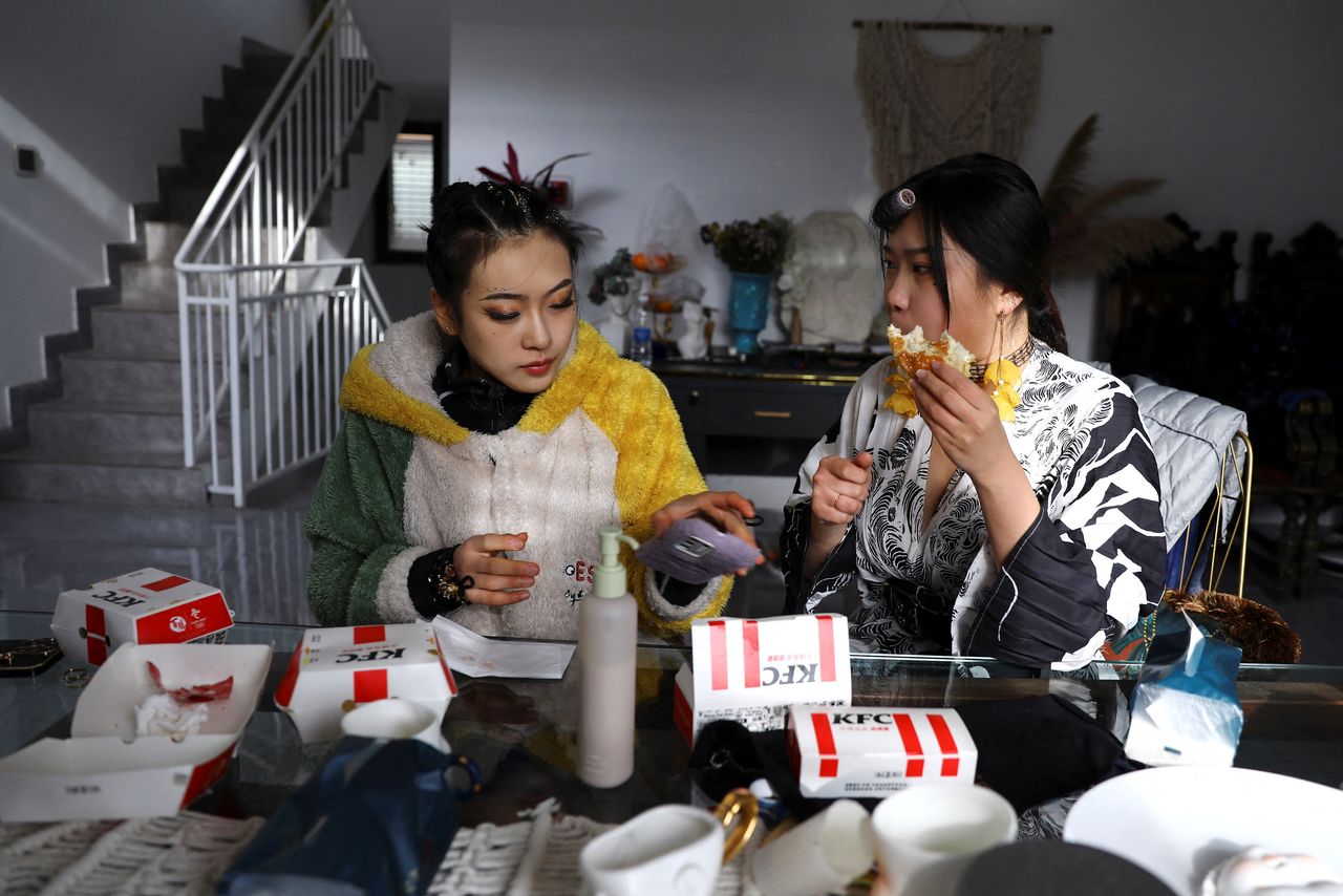 Costume designer Zhang Yifan has lunch as she chats with her sister, figure skating athlete Zhang Yixuan, after a training session, at her studio in Beijing, China December 11, 2021. REUTERS/Tingshu Wang