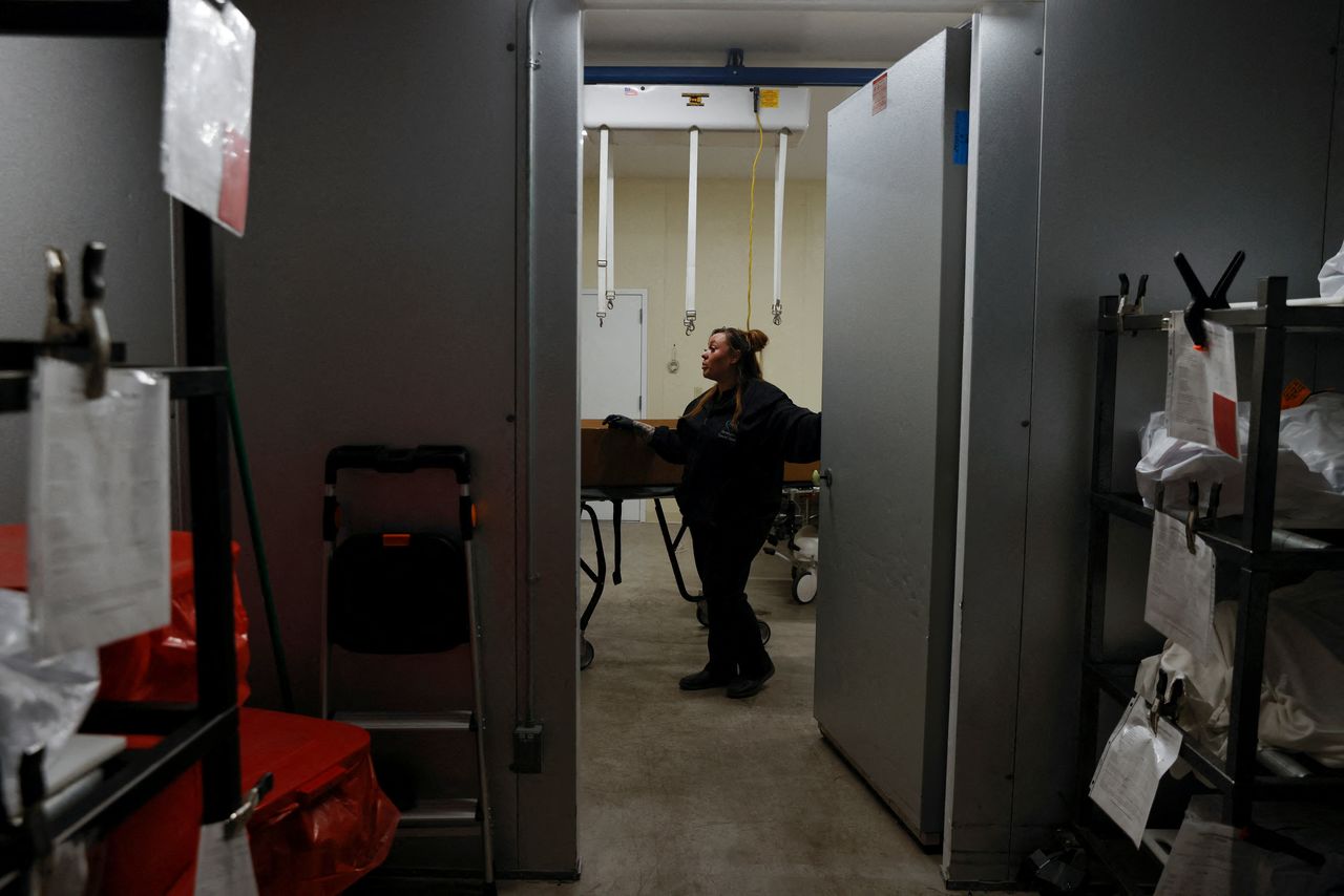 FILE PHOTO: Joanna Martinez, a funeral home worker, stands outside a refrigeration cooler with decedents who passed on due to the coronavirus disease (COVID-19) marked with red tags inside a refrigeration cooler with other bodies not affected at the Farmington Funeral Home in Farmington, New Mexico, U.S., December 14, 2021. REUTERS/Shannon Stapleton