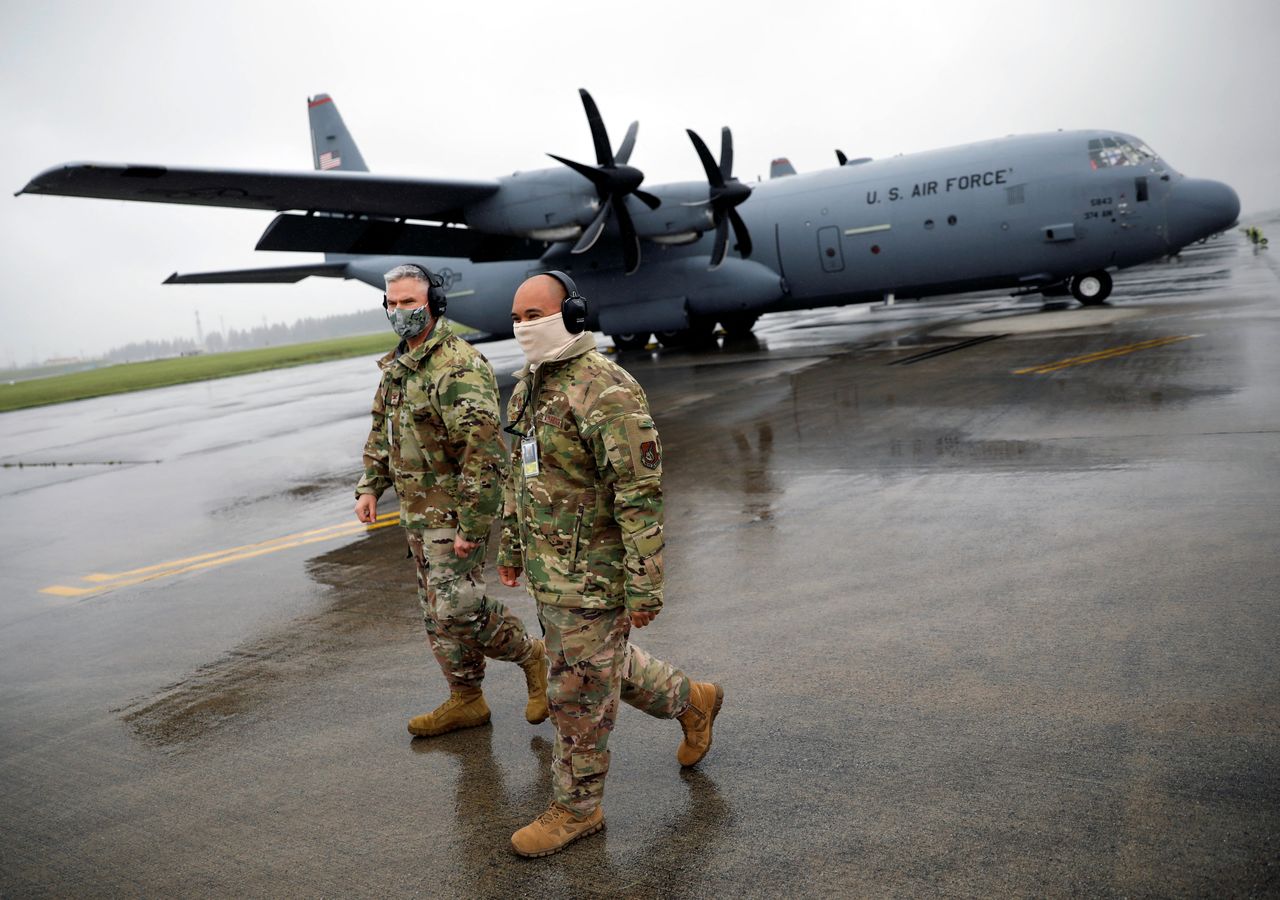FILE PHOTO: U.S. soldiers wearing protective face masks are seen in front of C-130 transport planes during a military drill amid the coronavirus disease (COVID-19) outbreak, at Yokota U.S. Air Force Base in Fussa, on the outskirts of Tokyo, Japan May 21, 2020. REUTERS/Issei Kato