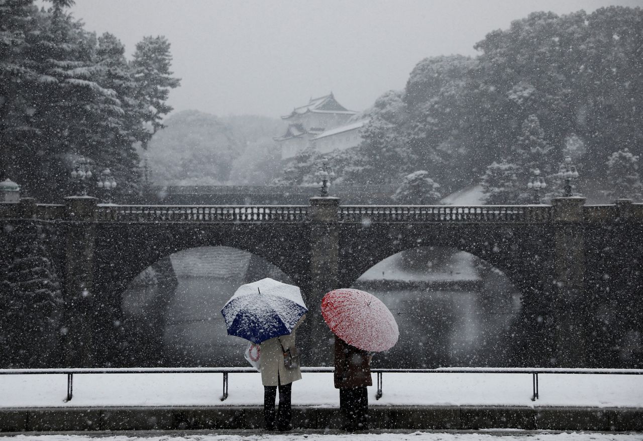 People look at the snow-covered Imperial Palace, amid the coronavirus disease (COVID-19) pandemic, in Tokyo, Japan January 6, 2022. REUTERS/Issei Kato