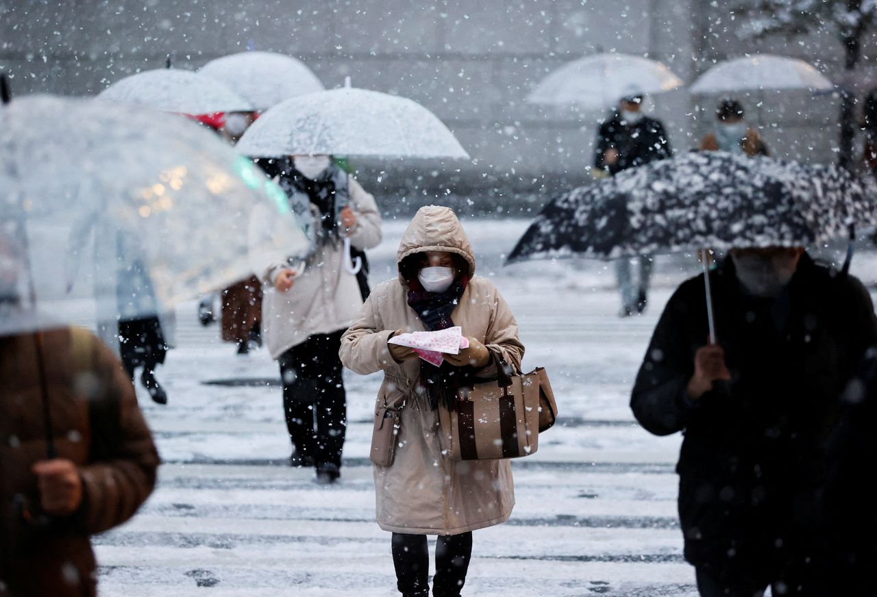 People wearing protective face masks walk on a street in snowfall, amid the coronavirus disease (COVID-19) pandemic, in Tokyo, Japan January 6, 2022. REUTERS/Issei Kato