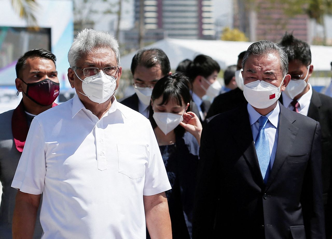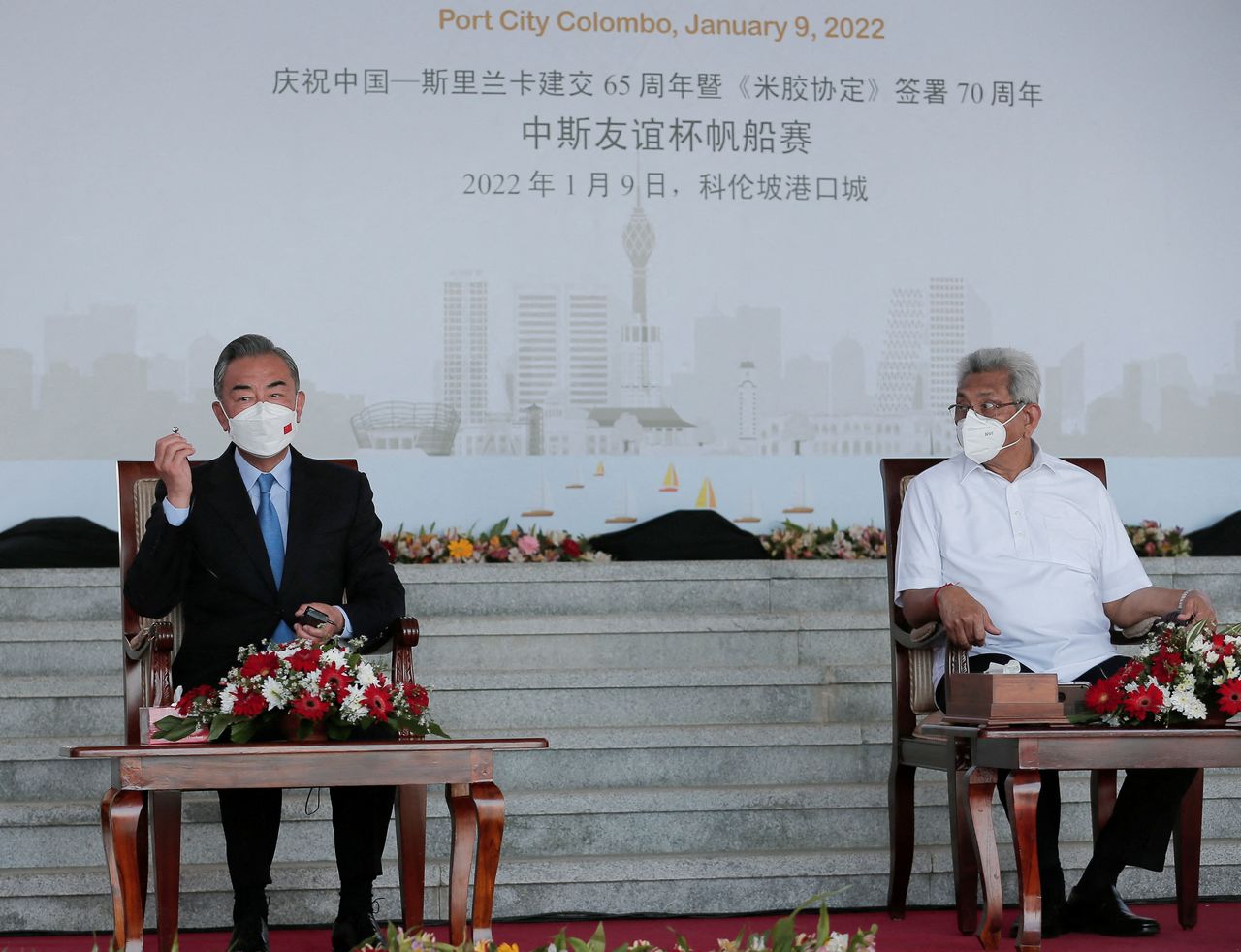 Chinese Foreign Minister Wang Yi sits with Sri Lanka's President Gotabaya Rajapaksa during his visit to Colombo Port city project, in Colombo, Sri Lanka, January 9, 2022. REUTERS/Dinuka Liyanawatte