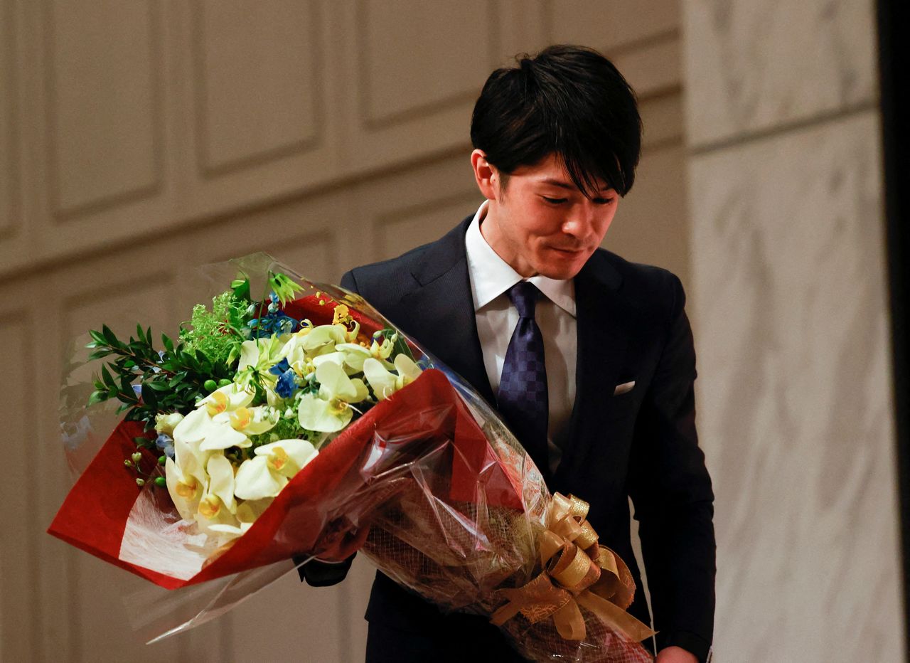 Japan's two-time Olympic all-around gymnastics champion Kohei Uchimura bows as he receives a bouquet at the end of a news conference on his retirement in Tokyo, Japan January 14, 2022. REUTERS/Issei Kato