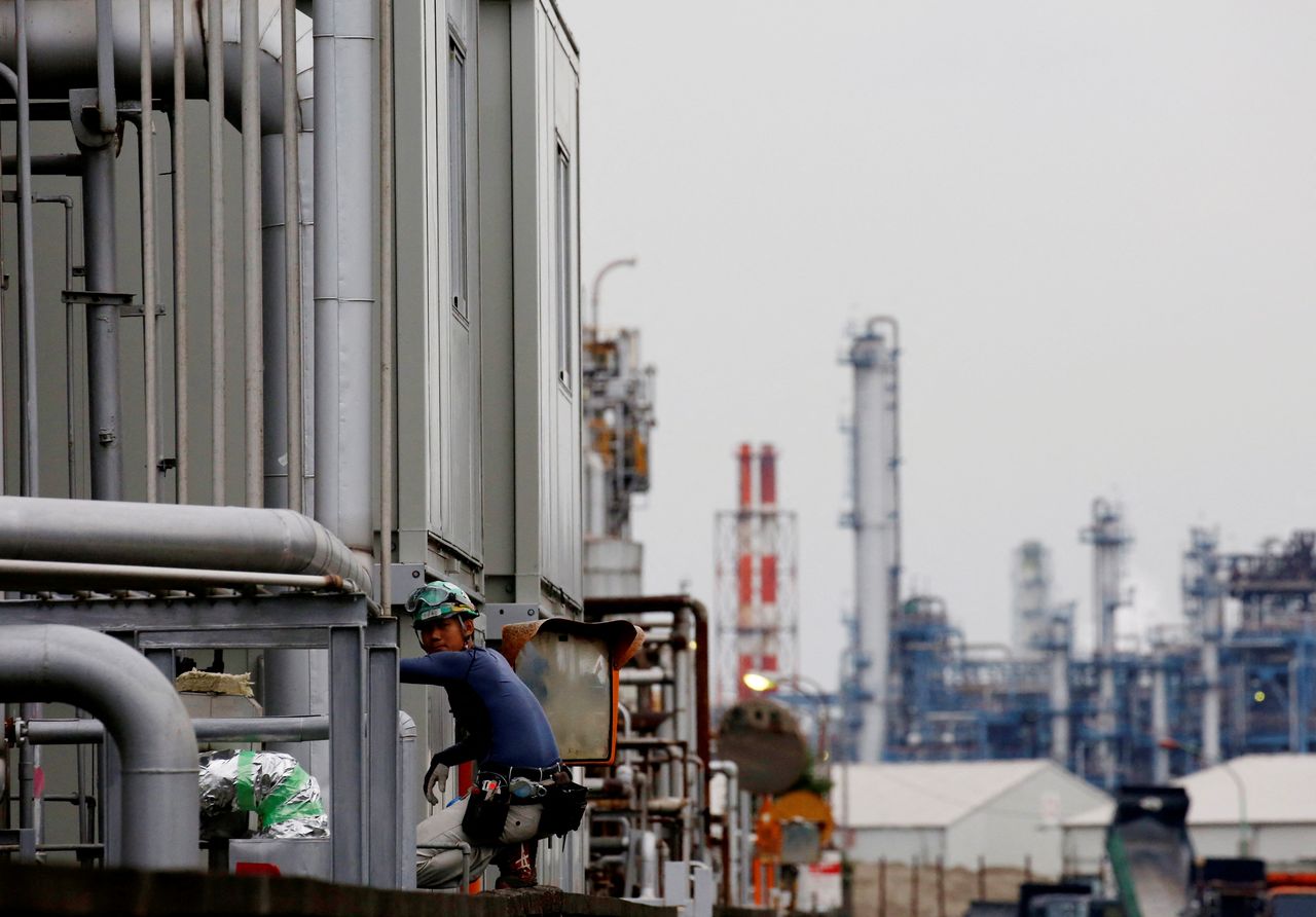 FILE PHOTO: A worker is seen in front of facilities and chimneys of factories at the Keihin Industrial Zone in Kawasaki, Japan September 12, 2018. REUTERS/Kim Kyung-Hoon