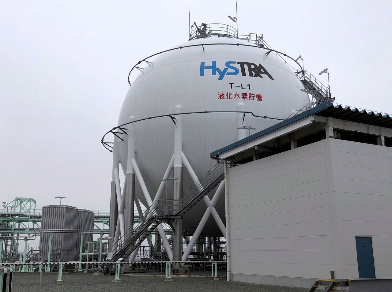 FILE PHOTO: The logo of the CO2-free Hydrogen Energy Supply-chain Technology Research Association (HySTRA) is seen on a liquefied hydrogen storage tank built by Kawasaki Heavy Industries at the hydrogen receiving terminal at the Kobe Airport Island in Kobe, western Japan January 22, 2021. REUTERS/Yuka Obayashi/File Photo
