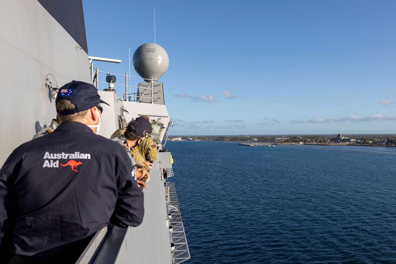 People stand onboard the HMAS Adelaide sailing into the port of Nuku’alofa as it carries disaster relief, after a volcanic eruption and tsunami devastated the South Pacific archipelago, on Tongatapu island, Tonga, January 26, 2022. Courtesy of Cpl Robert Whitmore/Australian Department Of Defence/Handout via REUTERS