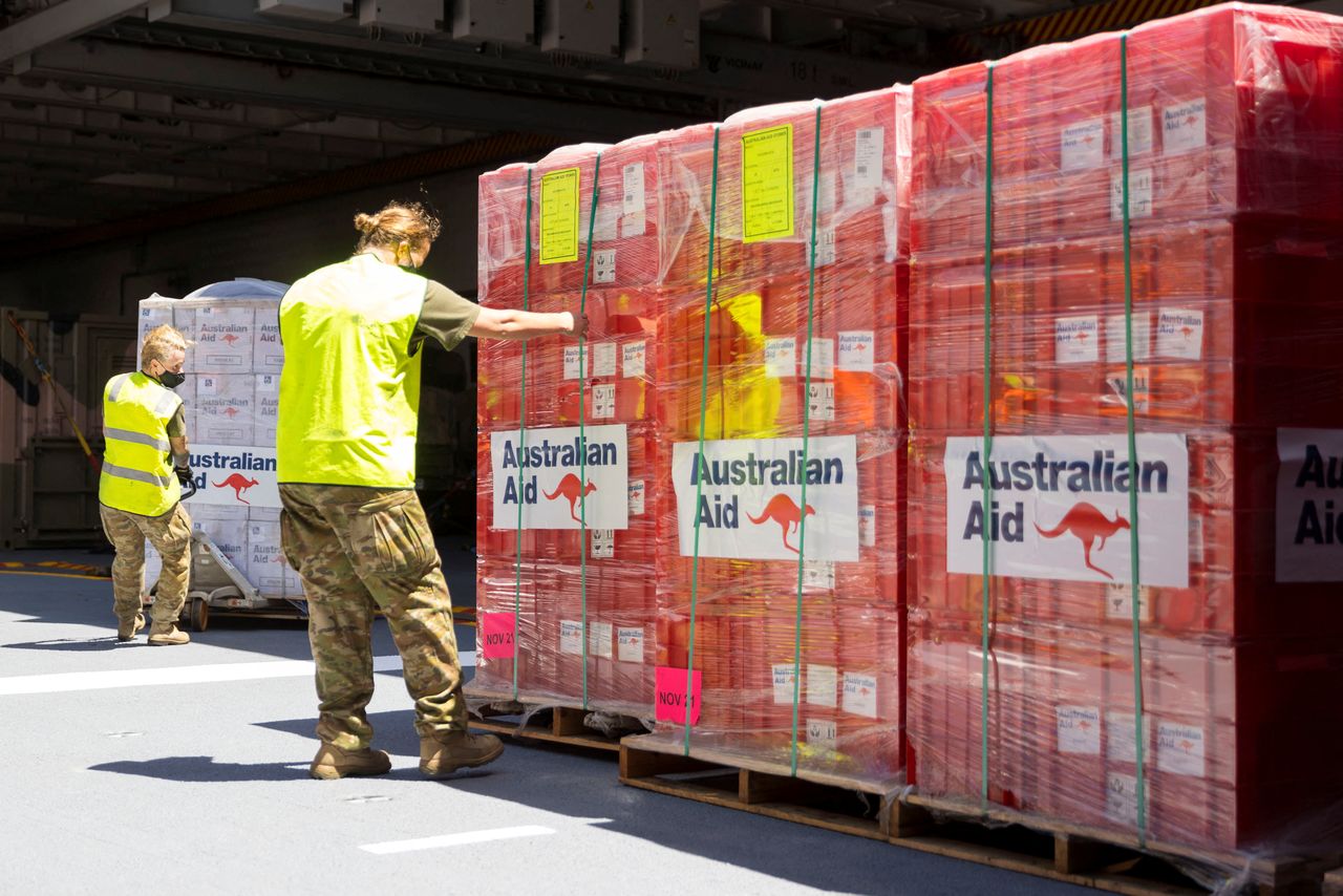 People prepare humanitarian aid as the HMAS Adelaide sails into the port of Nuku’alofa, Tonga, after a volcanic eruption and tsunami devastated the South Pacific archipelago, in this handout photo taken in an unknown location on January 26, 2022. Courtesy of Cpl Robert Whitmore/Australian Department Of Defence/Handout via REUTERS