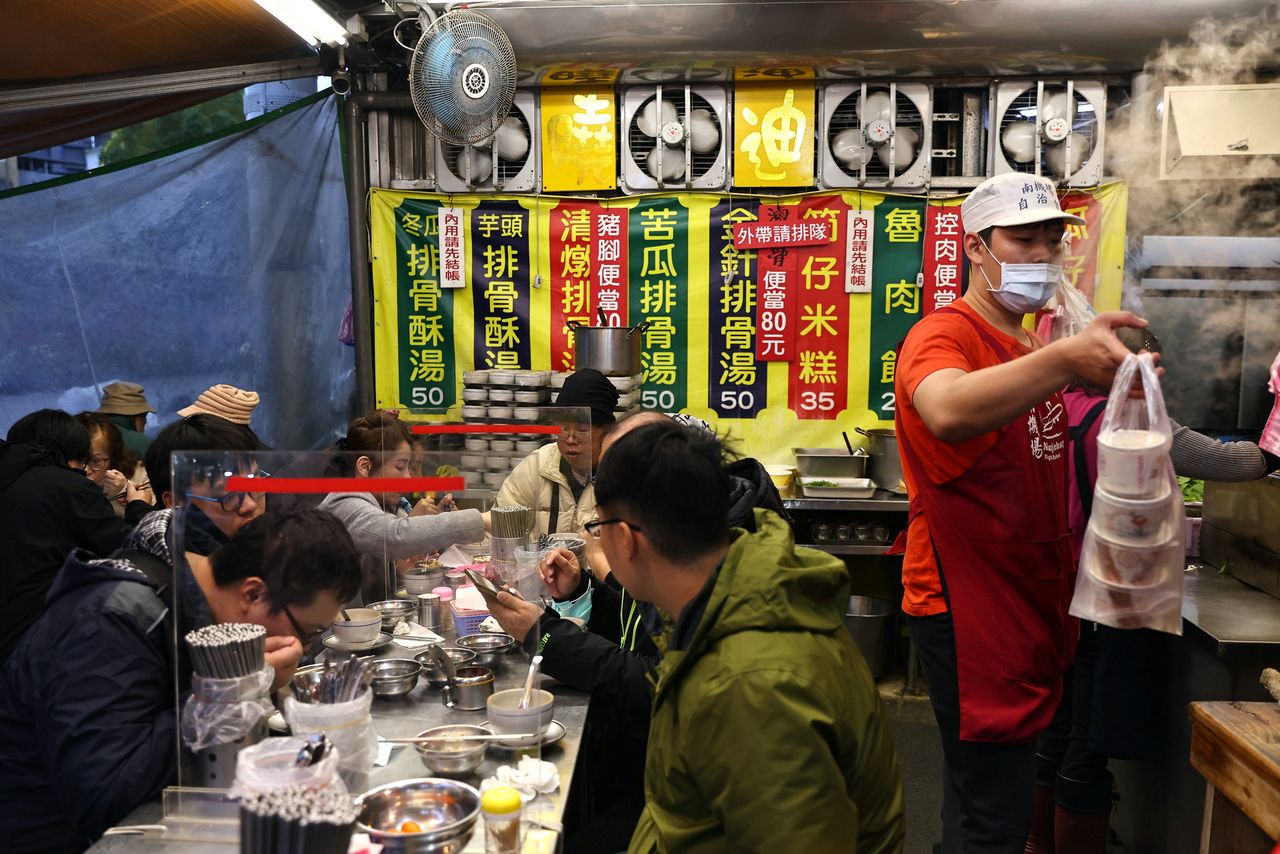 FILE PHOTO: A staff member wearing a protective mask, amid the coronavirus disease (COVID-19) pandemic, serves food in a restaurant at a market in Taipei, Taiwan, January 6, 2021. REUTERS/Ann Wang