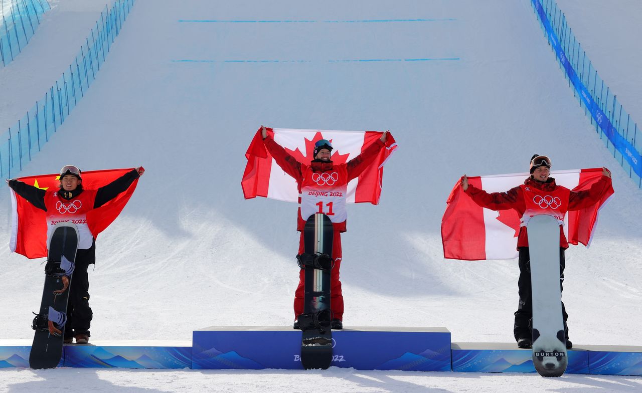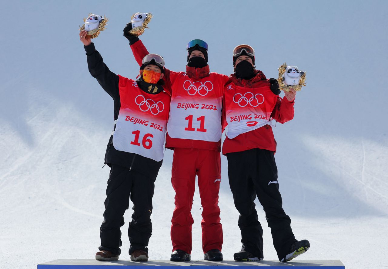 2022 Beijing Olympics - Snowboard - Men's SBD Slopestyle Final Run 1 - Genting Snow Park, Zhangjiakou, China - February 7, 2022. Su Yiming of China, Max Parrot of Canada and Mark McMorris of Canada pose for pictures on the podium. REUTERS/Marko Djurica