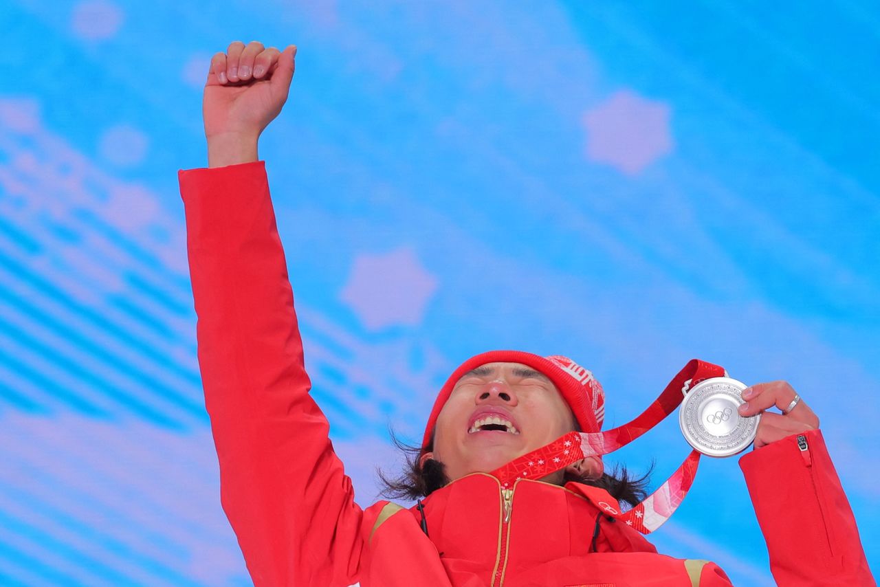 2022 Beijing Olympics - Victory Ceremony - Men's Snowboard Slopestyle - Zhangjiakou Medals Plaza, Zhangjiakou, China - February 7, 2022. Silver medallist, Su Yiming of China celebrates on the podium. REUTERS/Marko Djurica