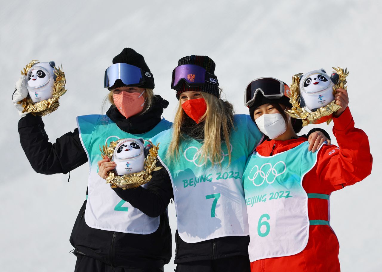 2022 Beijing Olympics - Snowboard - Women's Snowboard Big Air Final - Big Air Shougang, Beijing, China - February 15, 2022. Gold medallist Anna Gasser of Austria celebrates with silver medallist, Zoi Sadowski Synnott of New Zealand and bronze medallist, Murase Kokomo of Japan on the podium during the flower ceremony. REUTERS/Fabrizio Bensch