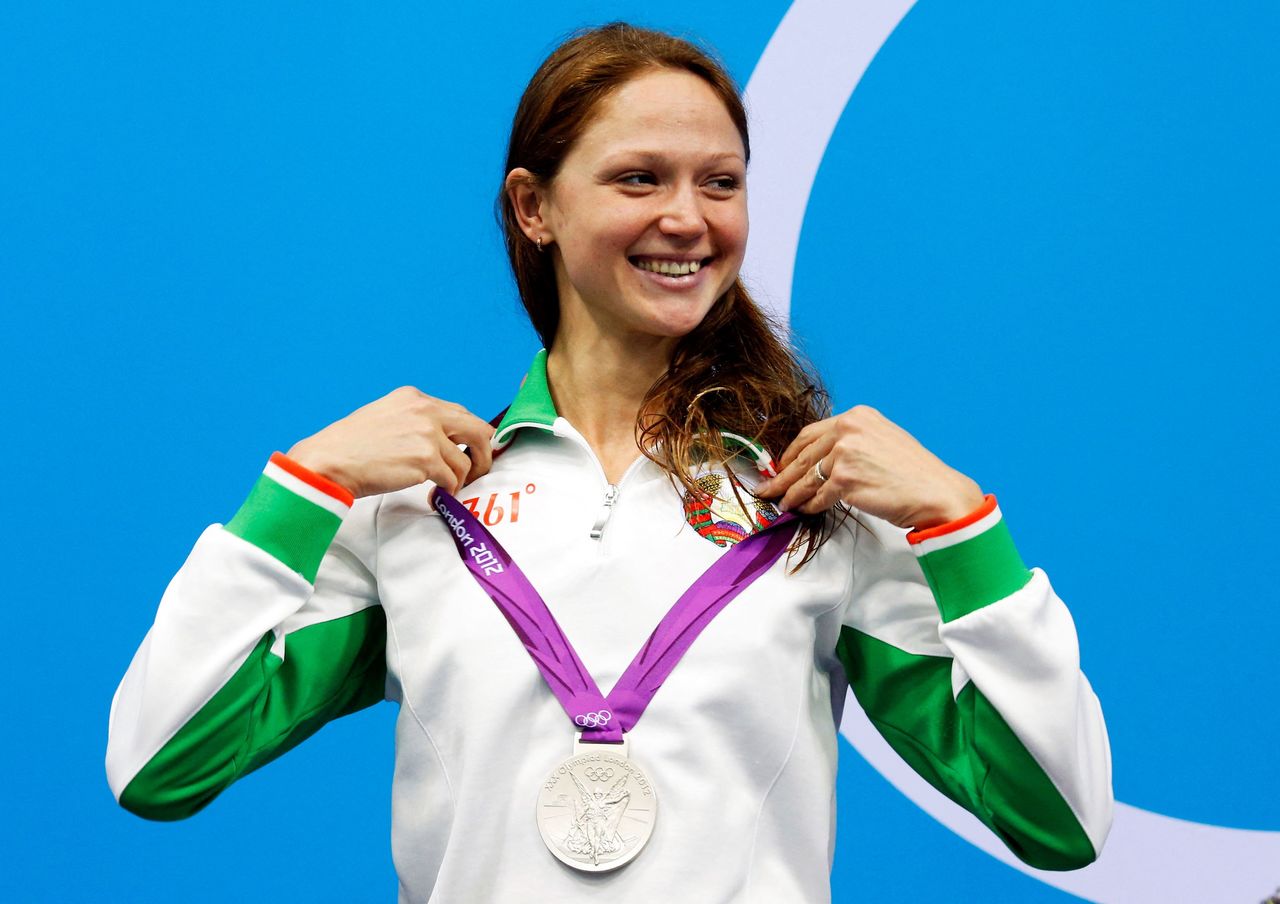 FILE PHOTO: Belarus' Aliaksandra Herasimenia smiles with her silver medal during the women's 100m freestyle victory ceremony during the London 2012 Olympic Games at the Aquatics Centre August 2, 2012. REUTERS/David Gray