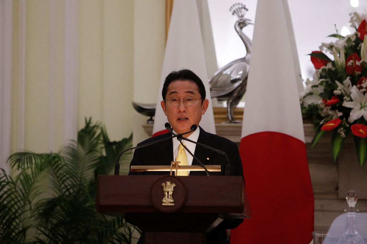 FILE PHOTO: Japanese Prime Minister Fumio Kishida speaks during a joint news conference with Indian Prime Minister Narendra Modi, at Hyderabad House in New Delhi, India, March 19, 2022. REUTERS/Adnan Abidi/File Photo