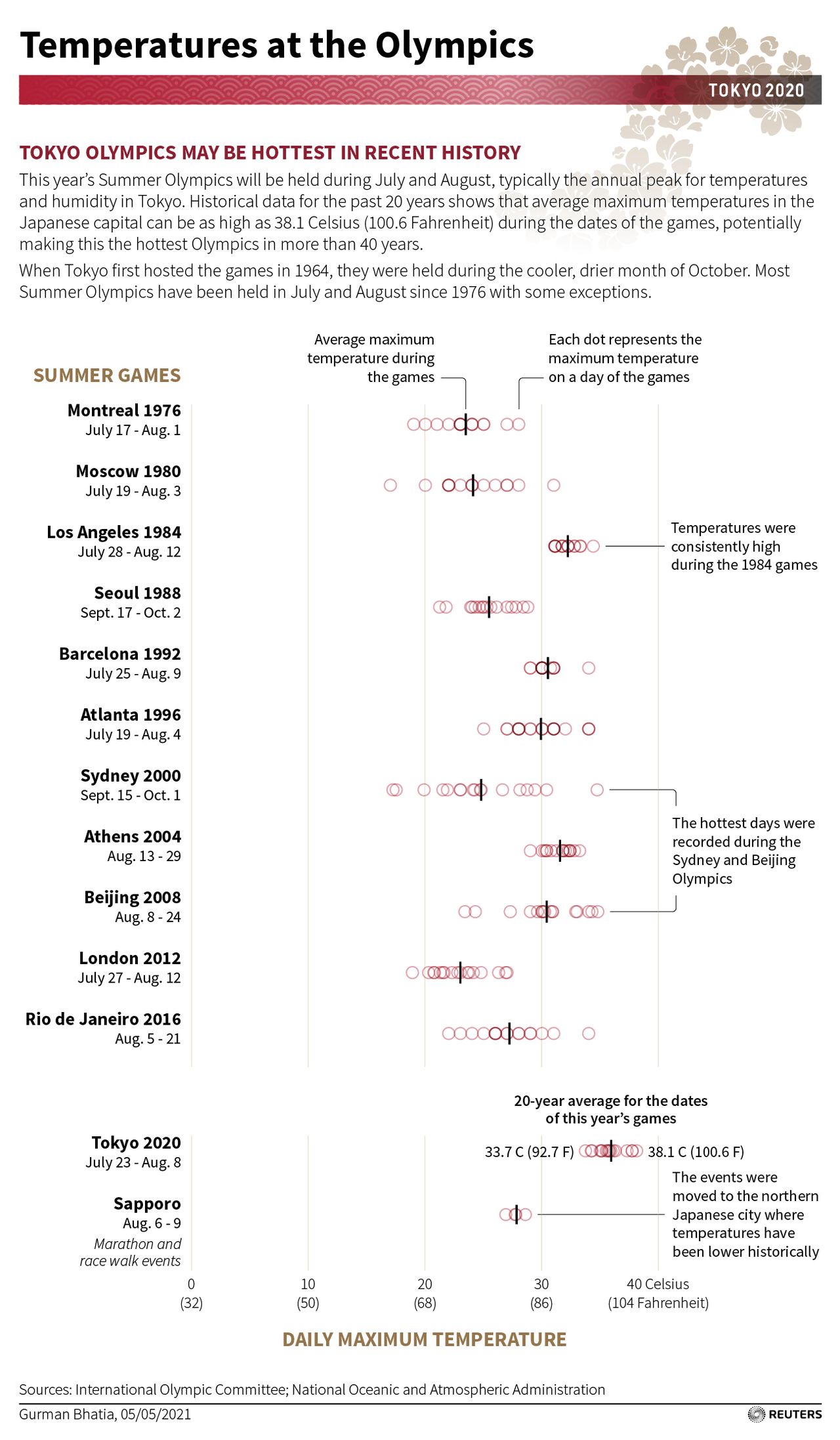 Tokyo 2020 Games Overview Historical Temperatures at the Summer Games Newsfrom Japan Sports Tokyo 2020 Jul 13, 2021 English 日本語 简体字 繁體字 Français Español العربية Русский Olympics Tokyo 2020 Reuters Tokyo 2020 Games Overview