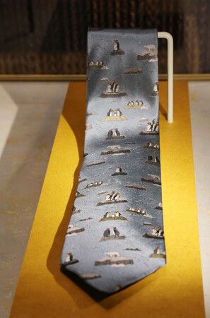 Also on display was a necktie with images of penguins and polar bears, both of which are susceptible to the effects of global warming. The necktie was donated by Syukuro Manabe, the 2021 Nobel Physics Prize laureate who was recognized for pioneering computer-based methods for projecting global warming and other meteorological phenomena.