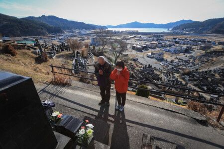 At the Koganji temple in Otsuchi, an Iwate town, local resident Takafumi Sasaki, 75, put his numbed hands together at the grave of his younger brother who died at 58 while working as a town official during the disaster.