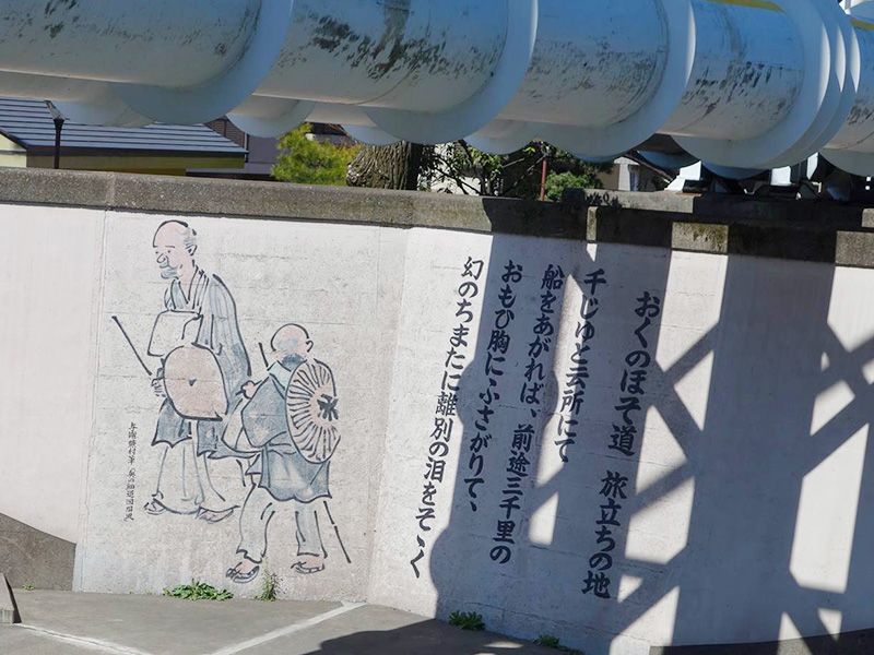 With all the urban development, visual tributes to Bashō’s historic undertaking seem rather squeezed into the landscape. In particular, a mural depicting Bashō and his disciple Kawai Sora, who accompanied him through most of the venture, is tucked away under water pipes that run parallel to Senju Ōhashi. A statue more successfully fits into a thin piece of land off the main road, while a stone pillar commemorates the famous starting point to one side of the bridge.