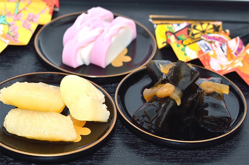 Osechi ryōri eaten at New Year typically includes kazunoko, herring roe (left foreground), which suggests “many children” and is considered lucky. The konbu (kelp) used to wrap konbumaki (sometimes pronounced kobumaki) kelp rolls (right foreground) is connected with yorokobu, or “to be happy.” Kamaboko fish cake (at back), meanwhile, is chosen for its auspicious colors rather than any linguistic associations.