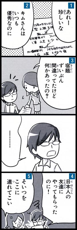 One recurring theme in the manga is the mismatch between the highly controlled language in student’s textbooks and what they hear in their everyday lives, which is often nonstandard or colloquial. Umino mentioned how some beginner students had asked her to teach the Kansai dialect as spoken in Osaka. “I’d tell them, ‘I like Kansai-ben, but there are some Japanese people who hate it!’” She suggests that it is safer to speak standard Japanese, because its neutral register makes it acceptable to anyone.