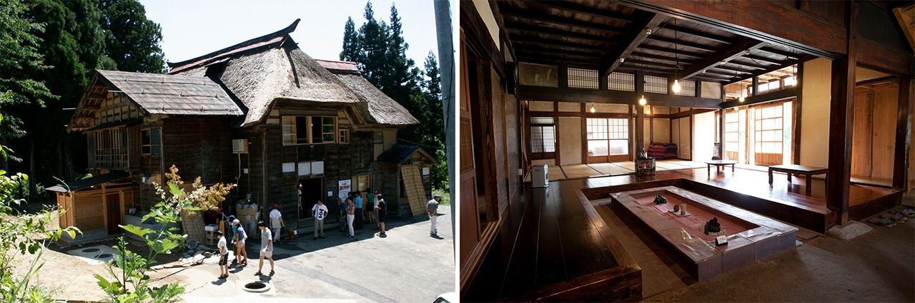 Left: Ubusuna House, a restored farmhouse in Tōkamachi, originally dating to 1924. (Photo by Kawase Kazue) Right: The first floor of Ubusuna House includes a restaurant that serves local cuisine on handcrafted pottery, while the second floor features a tea room and ceramics gallery. (Photo by Yanagi Ayumi)