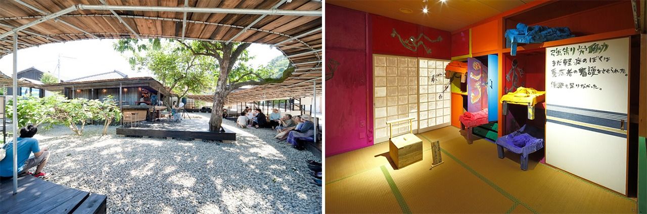 Left: Shima Kitchen, an abandoned house converted to a restaurant on the island of Teshima in the Seto Inland Sea. (Photo by Nakamura Osamu) Right: Tashima Seizō, Life of N: 70 Years on Ōshima—A Room with a Wooden Pot. (Photo by Kioku Keizō)
