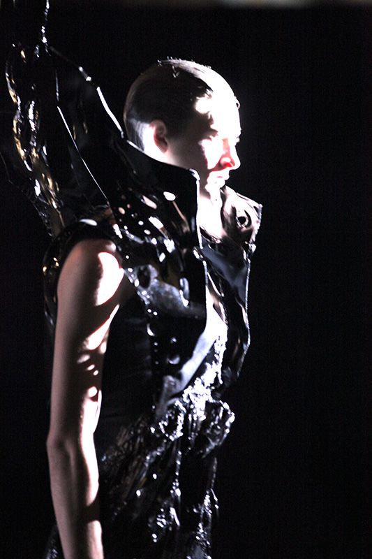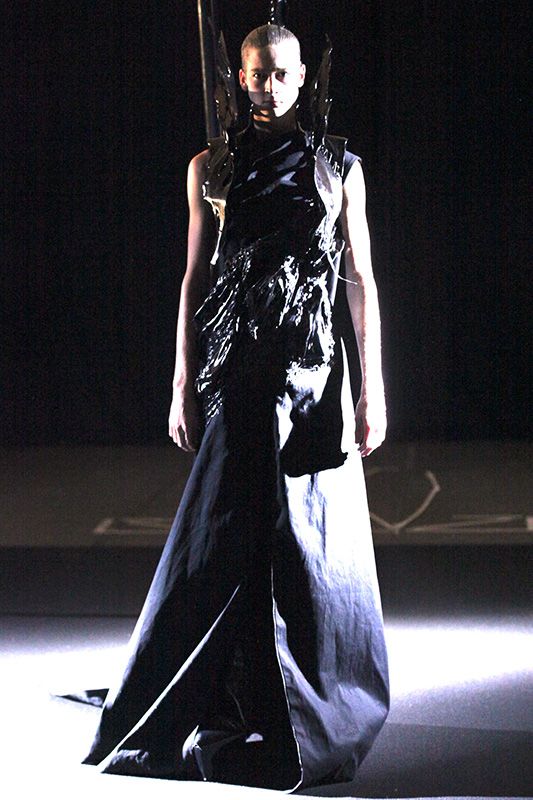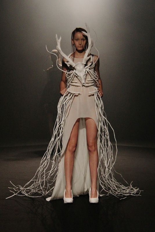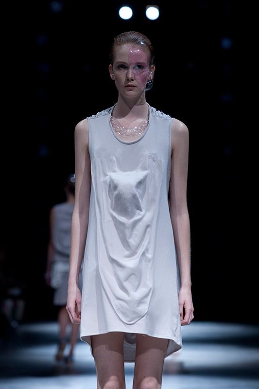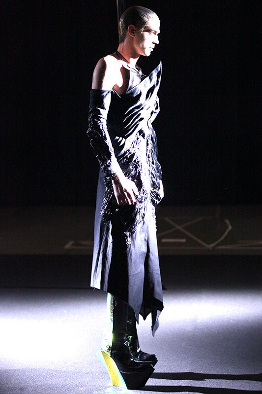 He designed Lady Gaga’s outfit for the MTV Aid Japan event held in June 2011. Inspired by his ongoing thoughts about death and the work S/N by the performance group dumb type, Morikawa takes on the challenge of visualizing bones, an icon for death, in his 2012 spring/summer collection Signal/Noize, a combination of fabric (signal) and mixed media (noize).