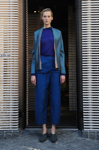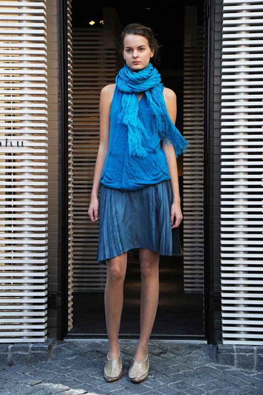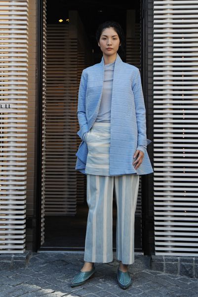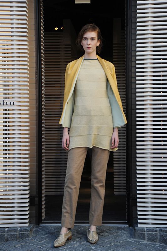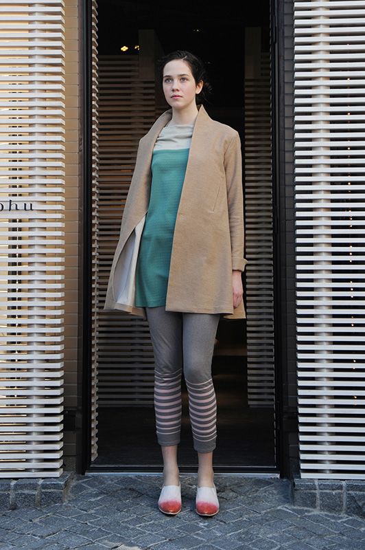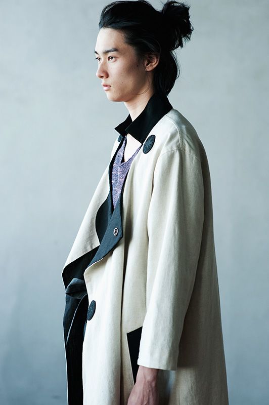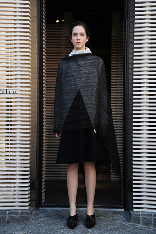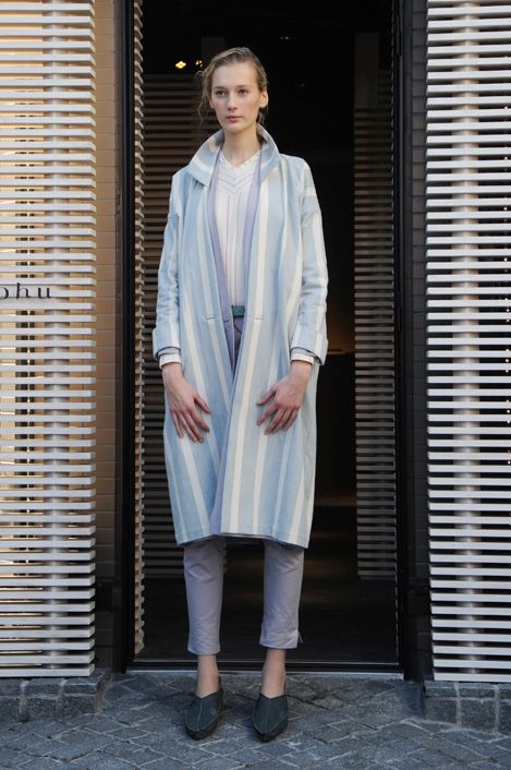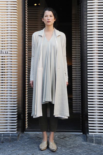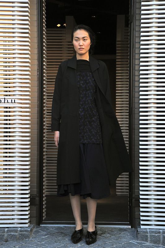 Established by Horihata Hiroyuki and Sekiguchi Makiko in 2005. After studying apparel design together at Bunka Fashion College and working for some time as patterners, they went over to England. They gained experience designing a collection in England from 2003 and then launched Matohu a year after their return to Japan in 2004. In 2009 the pair received the twenty-seventh Mainichi Fashion Grand Prix for Best New Designer and Shiseido Incentive Award. Their brand name, Matohu, has two meanings, “dressing” and “restraint,” which fittingly convey their concept centering on the Japanese sense of beauty toward clothing and also a sense of restraint, allowing oneself to mature, and not consuming something hastily and throwing it away. They presented their 2012 spring/summer collection, based on the theme utsuri (reflection), at their new shop in Omotesando, which opened in July 2011.