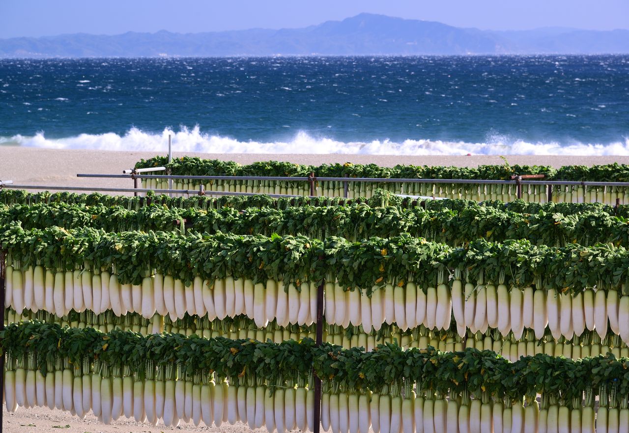Yanada Shinji: Ver hileras de daikon secándose en la playa fue algo nuevo para mí. En mi hogar, en la prefectura de Niigata, se cuelgan bajo los aleros de las casas con tiras de cuerda hechas de paja de arroz. Me hizo pensar en la amplia variedad de costumbres que pueden encontrarse en cada región.
