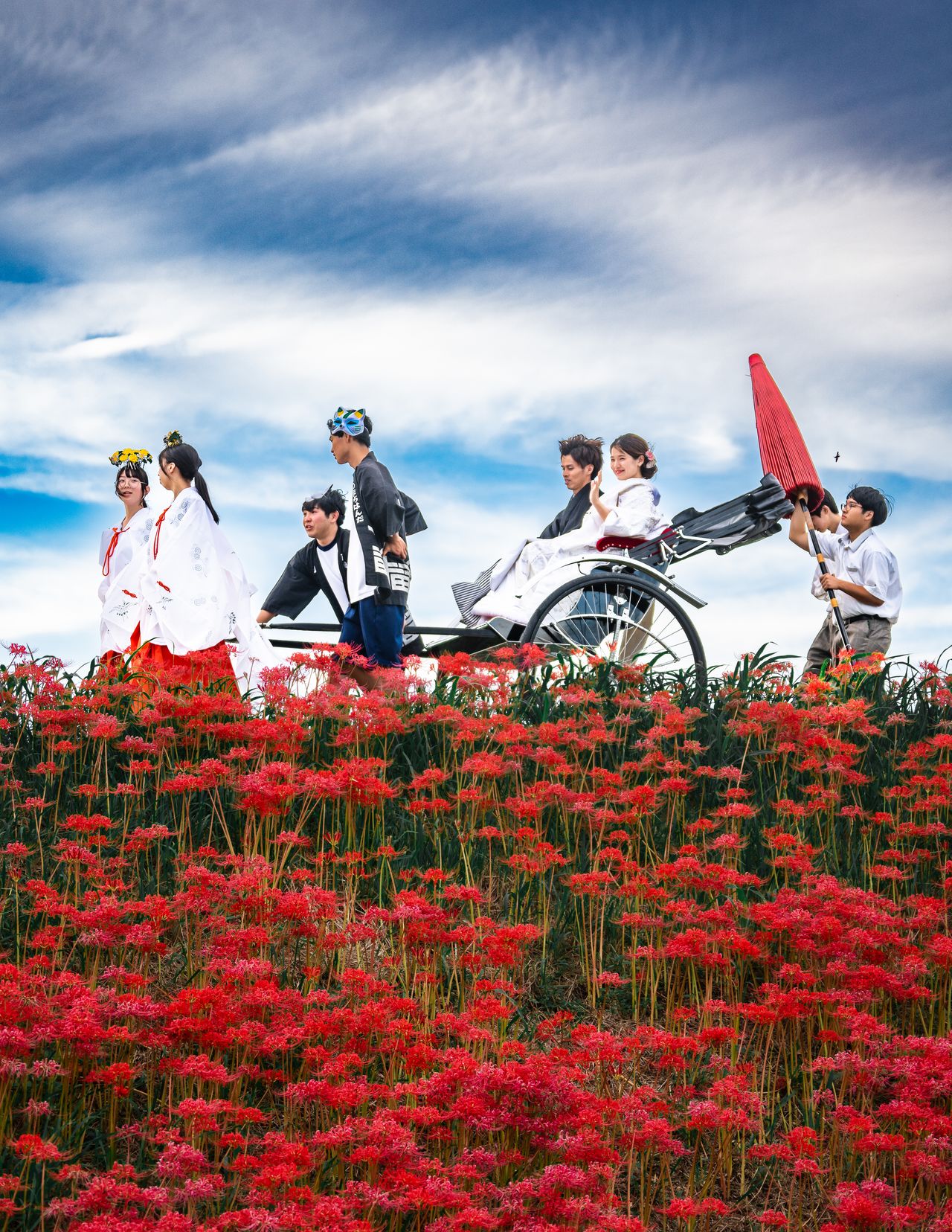 En esta foto, cuenta su creador, “una novia y su séquito cruzan un campo de higanbana (flores de equinoccio). La boda, una producción de unos estudiantes del Escuela Secundaria Comercial Handa de la prefectura de Aichi, tuvo lugar en el Museo Conmemorativo de Niimi Nankichi e incluyó este tributo a la obra maestra de la literatura infantil creada por Niimi, Gon, el pequeño zorro”.
