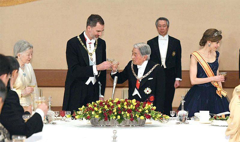 El Rey Felipe VI y el Emperador Akihito brindan en el banquete celebrado en la noche del 5 de marzo en el Palacio Imperial. (© Jiji)