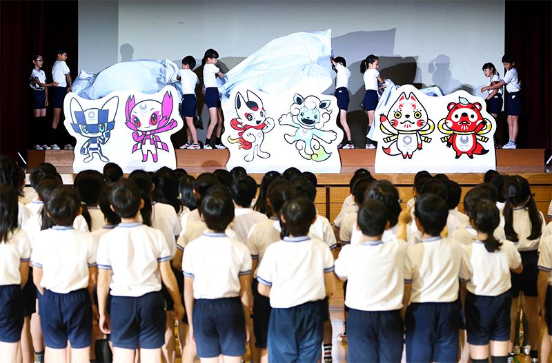 Las tres parejas finales candidatas a convertirse en las mascotas de Tokio 2020 fueron reveladas en una escuela primaria de Shibuya, en Tokio, el 7 de diciembre de 2017. (© Jiji)