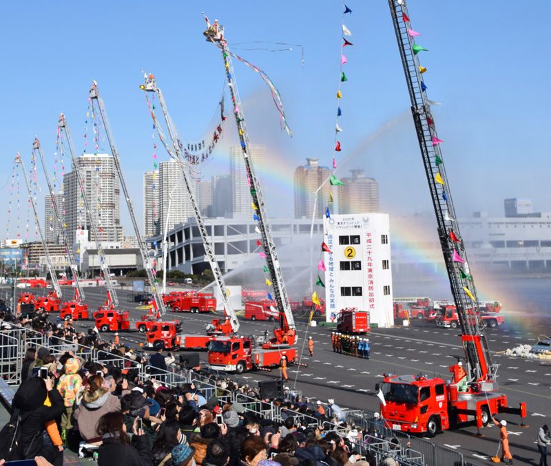 Tokio, 6 de enero (Jiji Press)— El Cuerpo de Bomberos de Tokio celebró el pasado sábado el dezomeshiki, un acto de Año Nuevo en el que se hicieron acrobacias en las escaleras, lanzamiento simultáneo de agua, simulacros de incendios, y hubo incluso un desfile.