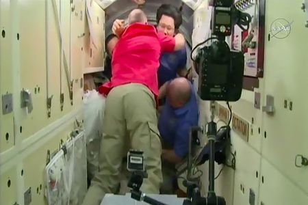 Kanai Norishige a su regreso desde la ISS (el segundo por la derecha). (Cortesía de Nasa Television)