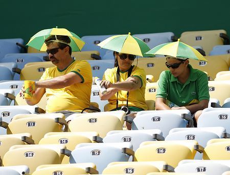 Tres espectadores utilizan sombrillas y se ponen protector solar en los Juegos Olímpicos de Río de Janeiro de 2016. Fotografía tomada en Río de Janeiro el 17 de agosto de 2016. (EPA Jiji)