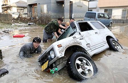 Unos vecinos de Kurashiki tratan de mover un automóvil que fue volteado por el agua.