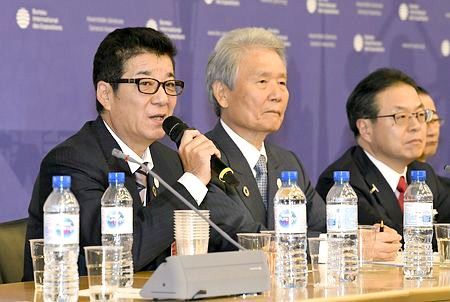 El gobernador de la prefectura de Osaka Matsui Ichirō ofrece una rueda de prensa junto con el presidente de la Patronal japonesa (en el centro) y el ministro de Economía e Industria (a la derecha) tras conocerse que Osaka será la sede de la Exposición Universal de 2025. El 23 de noviembre en París. (Jiji Press)