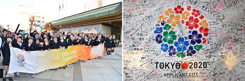 Izquierda: Niños reciben ante el Ryōgoku Kokugikan (Tokio) a los miembros de la Comisión de Evaluación del COI durante su visita oficial a los sitios designados por la candidatura de Tokio el 5 de marzo de 2013. Derecha: Bandera de la candidatura olímpica de Tokio, repleta de las firmas de atletas y personal relacionado con la misma. (Fotos cortesía de la Comisión de la Candidatura Olímpica Tokio 2020).