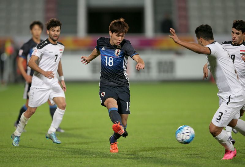Minamino Takumi durante el partido contra Irak, la semifinal de la ronda de clasificación para los Juegos Olímpicos de Río, el 26 de enero de 2016 (©Jiji Press).