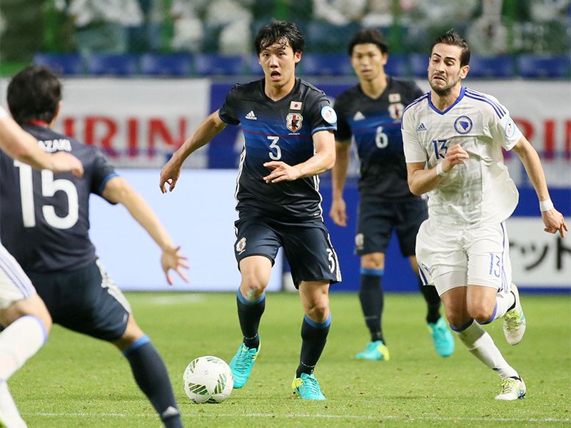 Regate de Endō durante la final de la Copa Kirin contra Bosnia Herzegovina, el 7 de junio de 2016 (©Jiji Press).