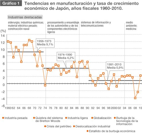 En el periodo siguiente, de 1974 a 1990, cuando el crecimiento anual era de media un 4,2%, el centro de atención pasó a las industrias de procesamiento y ensamblaje de los automóviles y de los componentes electrónicos ligeros, al convertirse Japón en el taller del mundo. La economía japonesa y sus industrias han continuado madurando desde entonces, y hoy la tendencia se dirige hacia industrias relacionadas con el medio ambiente y la atención médica. Mientras tanto, los países del grupo BRIC (Brasil, Rusia, India y China) están pasando de la industria pesada y la industria química al procesamiento y ensamblaje.