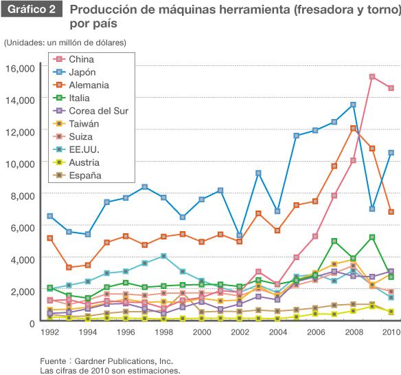 El Gráfico 2 muestra los cambios en las cifras de producción de máquinas herramienta (fresadora y torno) en países significativos. (Información extraída de un sondeo llevado a cabo por Gardner Publications, Inc., EE.UU.). El valor total de la producción en 2010 (28 países) fue aproximadamente de 48.230 millones de dólares. De esta cifra, Japón fue el segundo mayor productor (10.540 millones de dólares, el 22%) detrás de China (14.590 millones de dólares, el 30,2%). Alemania (6.830 millones de dólares, el 14,2%) fue el tercero. Estos tres países, colectivamente, han dominado el mercado estos últimos años. Japón superó a EE.UU. como líder mundial en producción de máquinas herramienta en 1982, al incrementar su solidez nacional a través de la producción en masa de automóviles. Japón permaneció en el primer puesto durante veintisiete años, hasta 2009.