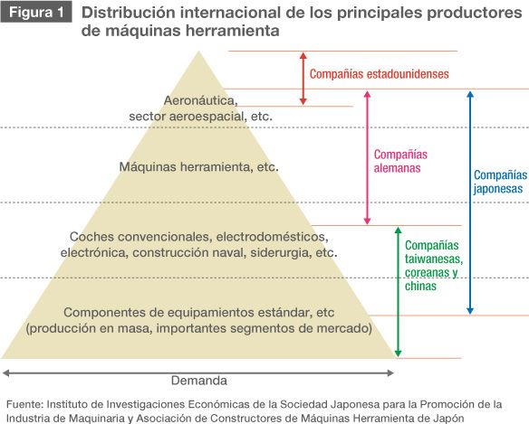 La Figura 1 muestra la distribución del mercado internacional de máquinas herramienta (basándose en material proporcionado por el Instituto de Investigaciones Económicas de la Sociedad Japonesa para la Promoción de la Industria de Maquinaria y la Asociación de Constructores de Máquinas Herramienta de Japón). La industria japonesa de máquinas herramienta abarca un amplio espectro, desde todo lo referente al espacio y la aeronáutica hasta componentes generales. Sin embargo, en términos de volumen, es de notar que la industria de las máquinas herramienta depende en gran parte de la industria de componentes automovilísticos, que produce entre 20.000 y 30.000 componentes diferenciados y representa el 60% de todos los pedidos de máquinas herramienta. Japón cuenta con doce fabricantes de automóviles, como por ejemplo Toyota, Nissan, Suzuki y Honda. Entre estas empresas construyeron unos 9,63 millones de coches en 2010 (un aumento del 121,3% con respecto al año anterior). Los fabricantes de componentes (nivel 1 y nivel 2) suministran piezas a estos fabricantes. La Asociación de Industrias de Componentes Automovilísticos de Japón cuenta con 442 miembros, con compañías como Denso, Aisin Seiki, NTN y KYB. Más abajo en la pirámide encontramos una amplia base de compañías de nivel 3 y nivel 4 que no son miembros de la asociación. La inversión de capital total en la industria de la automoción (inversión programada para el año fiscal 2008) era de 1,62 billones de yenes, equivalente al 21,6% del total de la industria manufacturera (7,52 billones de yenes). La inversión en máquinas herramienta sólo representa una pequeña fracción de este total. Según estadísticas recopiladas por la Asociación de Constructores de Máquinas Herramienta de Japón, los pedidos de la industria de la automoción representaron una cifra de 8.937 millones de yenes en 2010, el 9,1% del total. A primera vista, esto no parece equivaler a una dependencia del 60% en la industria de la automoción, pero si incluimos los pedidos de componentes y equipamientos para maquinaria de uso general, maquinaria eléctrica, y maquinaria de precisión destinada a la industria de la automoción, entonces la industria sí que representa aproximadamente el 60% de todos los pedidos. Las consecuencias están claras: la industria manufacturera japonesa en su conjunto está estructurada de tal forma que se estancará si una recesión económica afecta a la industria de la automoción. Esto es a la vez el punto fuerte y débil de la industria japonesa de máquinas herramienta. En la actualidad, la industria de la automoción está marchándose de Japón para aumentar su producción en fábricas en el extranjero. Si los gobiernos de estos países deciden fomentar el desarrollo de sus propias industrias de automoción e intentan congelar los productos japoneses aplicando leyes que favorezcan a componentes o máquinas herramienta producidos en sus propios paises, los fabricantes japoneses de máquinas herramienta se encontrarán sin ninguna base en la que apoyarse.