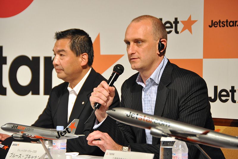 El presidente de Japan Airlines (JAL), Ōnishi Masaru, y el consejero delegado de Jetstar Group, Bruce Buchanan, durante la rueda de prensa convocada con ocasión de la fundación en Japón de la empresa Jetstar Japan (agosto de 2011). Jetstar Japan es una iniciativa de JAL, Jetstar (incluida en el grupo australiano Qantas) y Mitsubishi Corp.