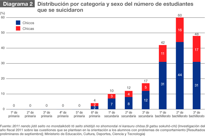 En Japón, el suicidio de estudiantes varones es dos o tres veces más numeroso que el de chicas. Según la encuesta realizada por el Ministerio de Educación, Cultura, Deportes, Ciencia y Tecnología, en el año fiscal 2011 el número de suicidios se contabilizó de la siguiente manera: 27 chicos y 12 chicas estudiantes de secundaria, 111 chicos y 46 chicas estudiantes de bachillerato (Diagrama 2). Por otra parte, las estadísticas de la Policía Nacional indican que el 70% de las víctimas totales de suicidio son hombres. La Policía y el Ministerio de Educación en los últimos años no han publicado datos sobre la proporción por sexos de suicidios debido al acoso escolar; de la tendencia general se estima que el número de chicos que se suicidan motivados por el acoso escolar es el doble o el triple que el de chicas.