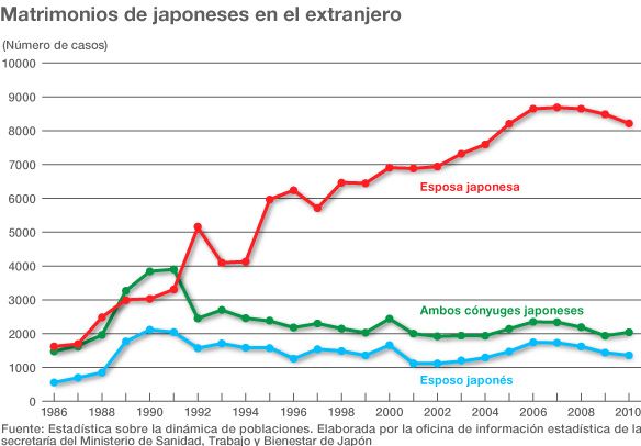 Desde la época de la burbuja financiera los matrimonios transnacionales aumentaron considerablemente en Japón. De hecho, tras el estallido de la burbuja el aumento en el número de matrimonios mixtos se acentuó notablemente. (Ver la gráfica de abajo)